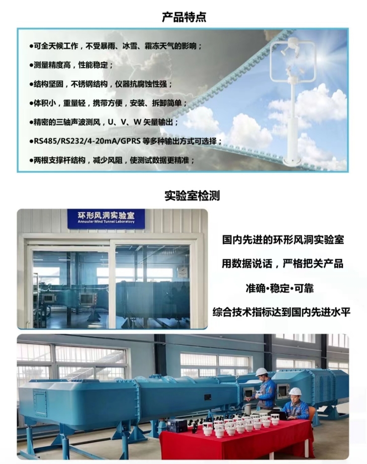 三維超聲波風(fēng)速風(fēng)向傳感器具有結(jié)構(gòu)緊湊,沒有任何移動部件,堅(jiān)固 耐用的特點(diǎn)。能夠測量水平和垂直方向的風(fēng)向, X/Y/Z軸風(fēng)速(即U、V、 W矢量輸出)??梢赃m應(yīng)在各種環(huán)境下,全天候、長久的正常工作,為各 領(lǐng)域的氣象監(jiān)測提供可靠數(shù)據(jù)。三維超聲波風(fēng)向風(fēng)速傳感器用來測量近 地風(fēng)向、風(fēng)速。廣泛應(yīng)用于城市環(huán)境監(jiān)測、風(fēng)力發(fā)電、氣象監(jiān)測、橋梁 隧道、航海船舶、航空機(jī)場等領(lǐng)域。