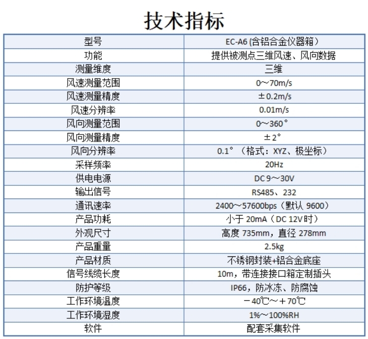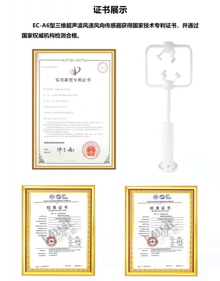 EC-A6型三維超聲波風(fēng)速風(fēng)向傳感器采用先進(jìn)的超聲波測量技術(shù),獨(dú)特的兩根支撐桿結(jié)構(gòu)設(shè)計(jì),大大減小了風(fēng)阻的影響,提升了測量的精度。它具有全金屬材質(zhì),沒有任何移動部件,堅(jiān)固耐用的特點(diǎn),可以同時測量水平和垂直方向的風(fēng)向, X/Y/Z軸風(fēng)速(即U、V、W矢量輸出),聲溫、聲速等參數(shù)。適應(yīng)在各種環(huán)境下,全天候、長久的正常工作,為各領(lǐng)域的氣象監(jiān)測提供可靠數(shù)據(jù)。三維超聲波風(fēng)向風(fēng)速傳感器用來測量近地風(fēng)向、風(fēng)速。廣泛應(yīng)用于城市環(huán)境監(jiān)測、風(fēng)力發(fā)電、氣象監(jiān)測、橋梁隧道、航海船舶、航空機(jī)場等領(lǐng)域。