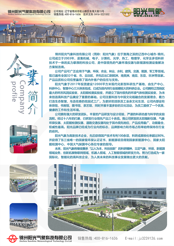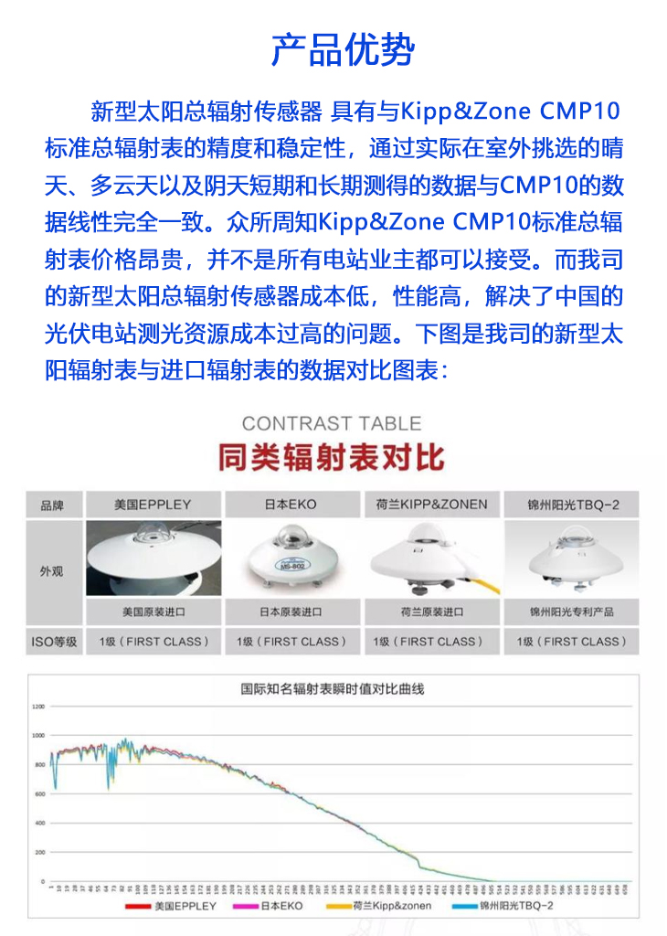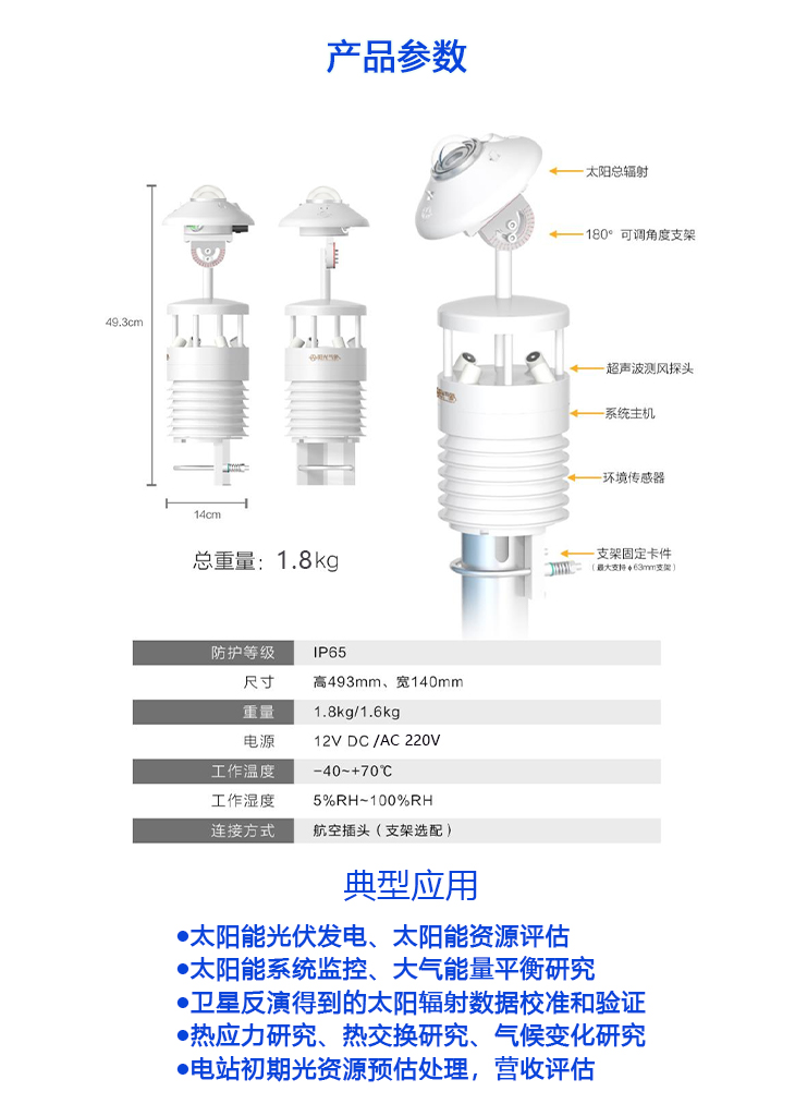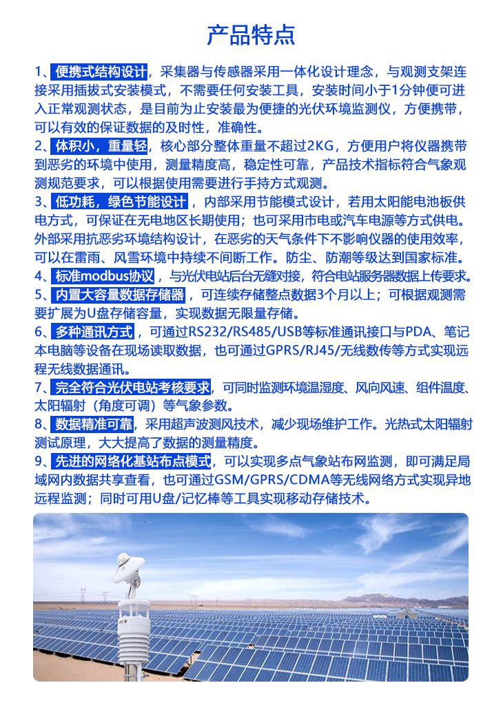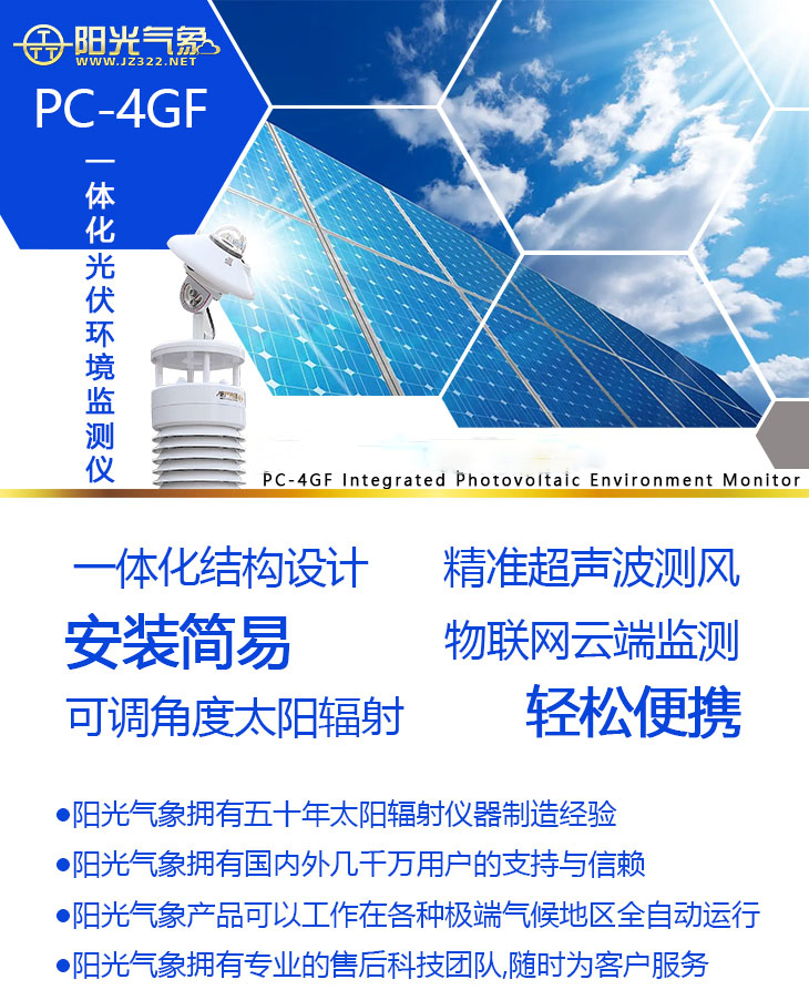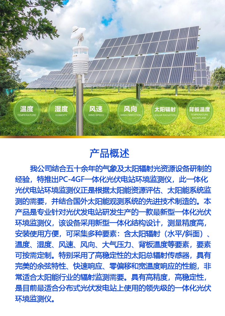 本產(chǎn)品是針對(duì)光伏發(fā)電站研發(fā)生產(chǎn)的一款最新型一體化光伏環(huán)境監(jiān)測(cè)儀,該設(shè)備采用新型一體化結(jié)構(gòu)設(shè)計(jì),測(cè)量精度高,安裝使用方便,可采集多種要素:含太陽輻射(水平/斜面)、溫度、濕度、風(fēng)速、風(fēng)向、大氣壓力、背板溫度等要素,要素可按需定制。
