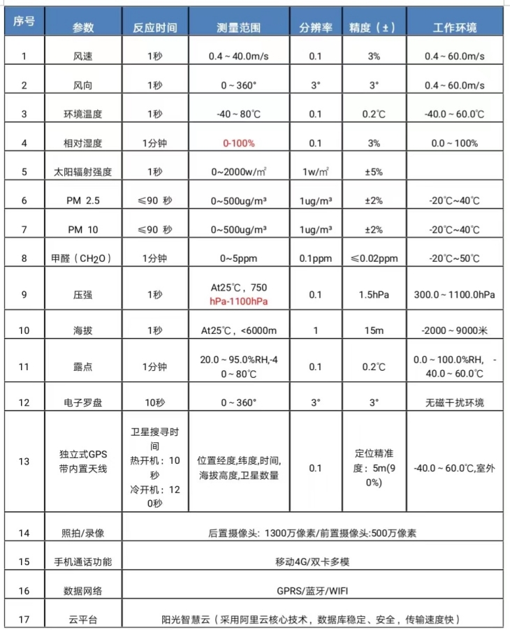 測(cè)量要素為:風(fēng)速,風(fēng)向,環(huán)境溫度,環(huán)境濕度,氣壓,太陽(yáng)輻射,風(fēng)寒指數(shù),熱指數(shù),露點(diǎn),海拔高度,位置經(jīng)度緯度,電子羅盤,時(shí)間,空氣質(zhì)量、PM2.5、PM10、甲醛、照拍/錄像 , 手機(jī)通話功能 , GPRS無(wú)線數(shù)據(jù)網(wǎng)絡(luò),數(shù)據(jù)云平臺(tái)。