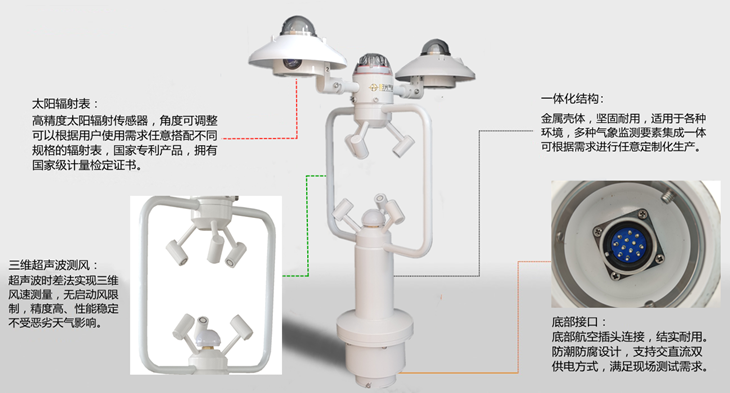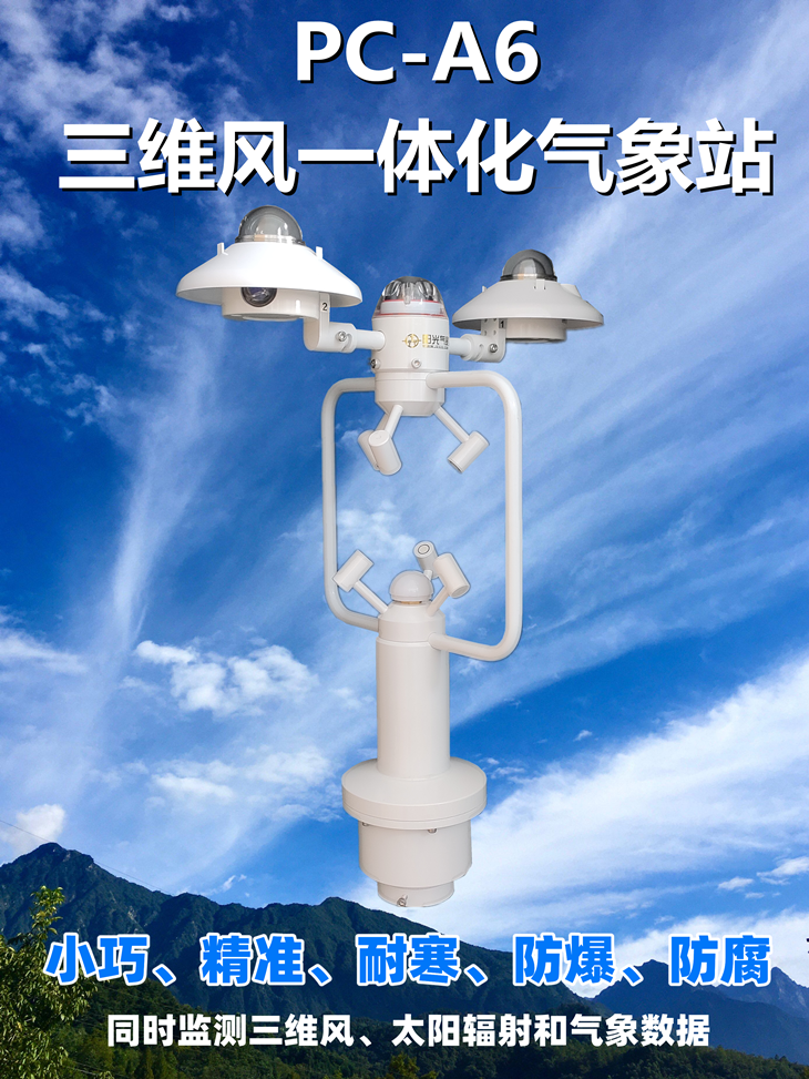 PC-A6三維風(fēng)一體化氣象站是錦州陽(yáng)光氣象科技有限公司自主研發(fā)的一款便于安裝、測(cè)量精度高、性能穩(wěn)定,并將三維超聲波測(cè)風(fēng)技術(shù)與環(huán)境監(jiān)測(cè)技術(shù)完美結(jié)合的一款一體化氣象站。 除了可同時(shí)監(jiān)測(cè)環(huán)境溫度、環(huán)境濕度、氣壓、雨量、太陽(yáng)輻射五大環(huán)境基本要素外,還可以監(jiān)測(cè)三維超聲波風(fēng)向風(fēng)速。