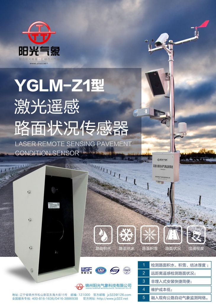 YGLM-Z1型是一款激光遙感非接觸式路面狀況傳感器,它采用激光遙感技術(shù),避免了對道路的破壞,從而不會因為安裝道路氣象站引起的對交通的干擾。多光譜測量技術(shù)使得能準(zhǔn)確檢測出道路表面結(jié)冰、積雪和積水的厚度。在埋入式路面?zhèn)鞲衅鞑槐慊虿荒馨惭b的路面條件下,YGLM-Z1型遙感式路面狀況傳感器是最理想的選擇。遙感安裝,意味著不需要封閉道路、不需要切割路面,安裝工作既安全又方便。維護(hù)量少,是道路氣象系統(tǒng)組成中一項理想選擇。它既可以安裝在現(xiàn)有的氣象站上,也可以安裝在路面視野無遮擋的其他建筑物上。