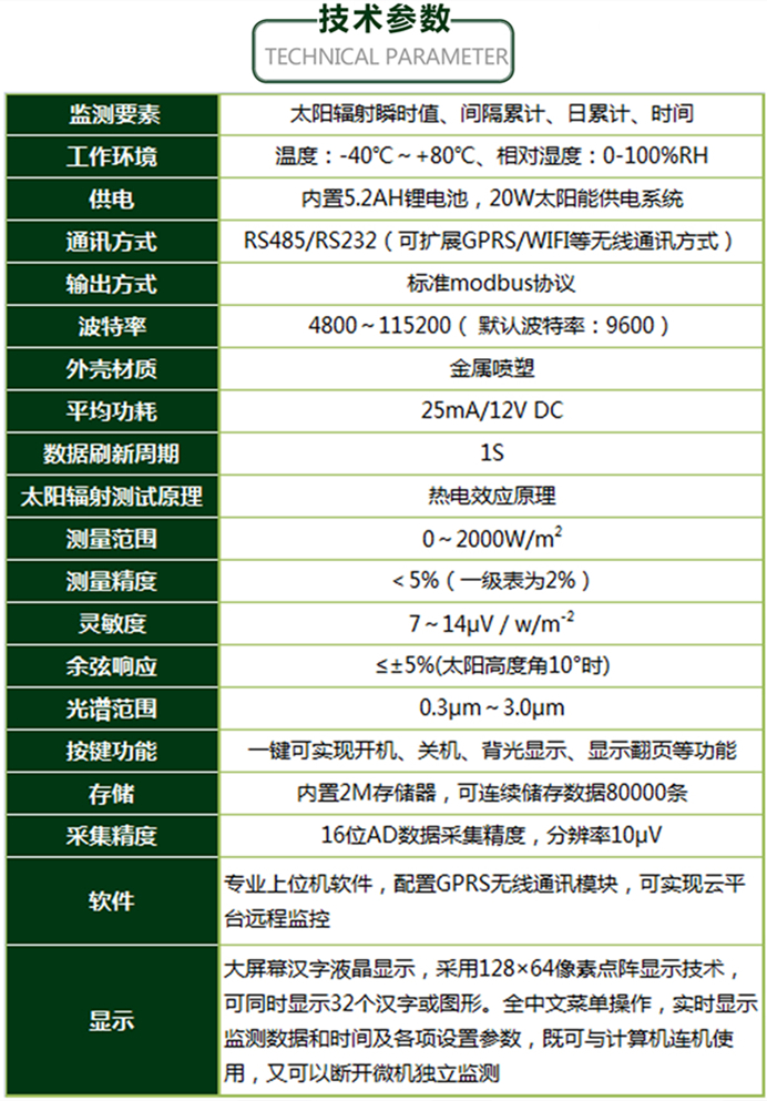 TBQ-2W太陽輻射儀是陽光氣象公司研發(fā)生產(chǎn)的手持輻射儀,它具有體積小、重量輕、精度高、性能穩(wěn)定等特點(diǎn),這款產(chǎn)品集監(jiān)測(cè)、顯示、存儲(chǔ)、通訊等功能于一體,是一款能手持監(jiān)測(cè)的太陽輻射儀。TBQ-2W的研發(fā)解決了常規(guī)手持輻射儀測(cè)量精度低,而高精度輻射產(chǎn)品又系統(tǒng)龐大的問題。另外本產(chǎn)品采用了防腐、防爆、防水、防震、防塵等高防護(hù)級(jí)別的設(shè)計(jì)理念,可滿足各種特殊環(huán)境的使用需求,是軍事、航海、科研等領(lǐng)域產(chǎn)品。